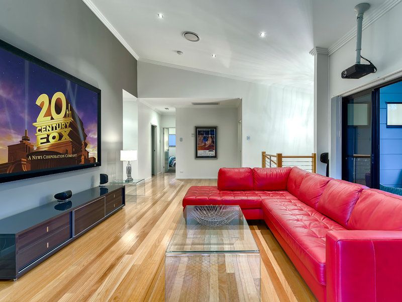 Generous living / theatre room with projector and screen