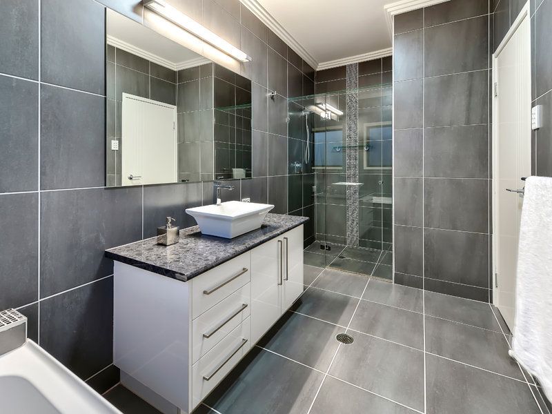 Designer bathrooms featuring floor to ceiling tiling and frameless glass shower screens