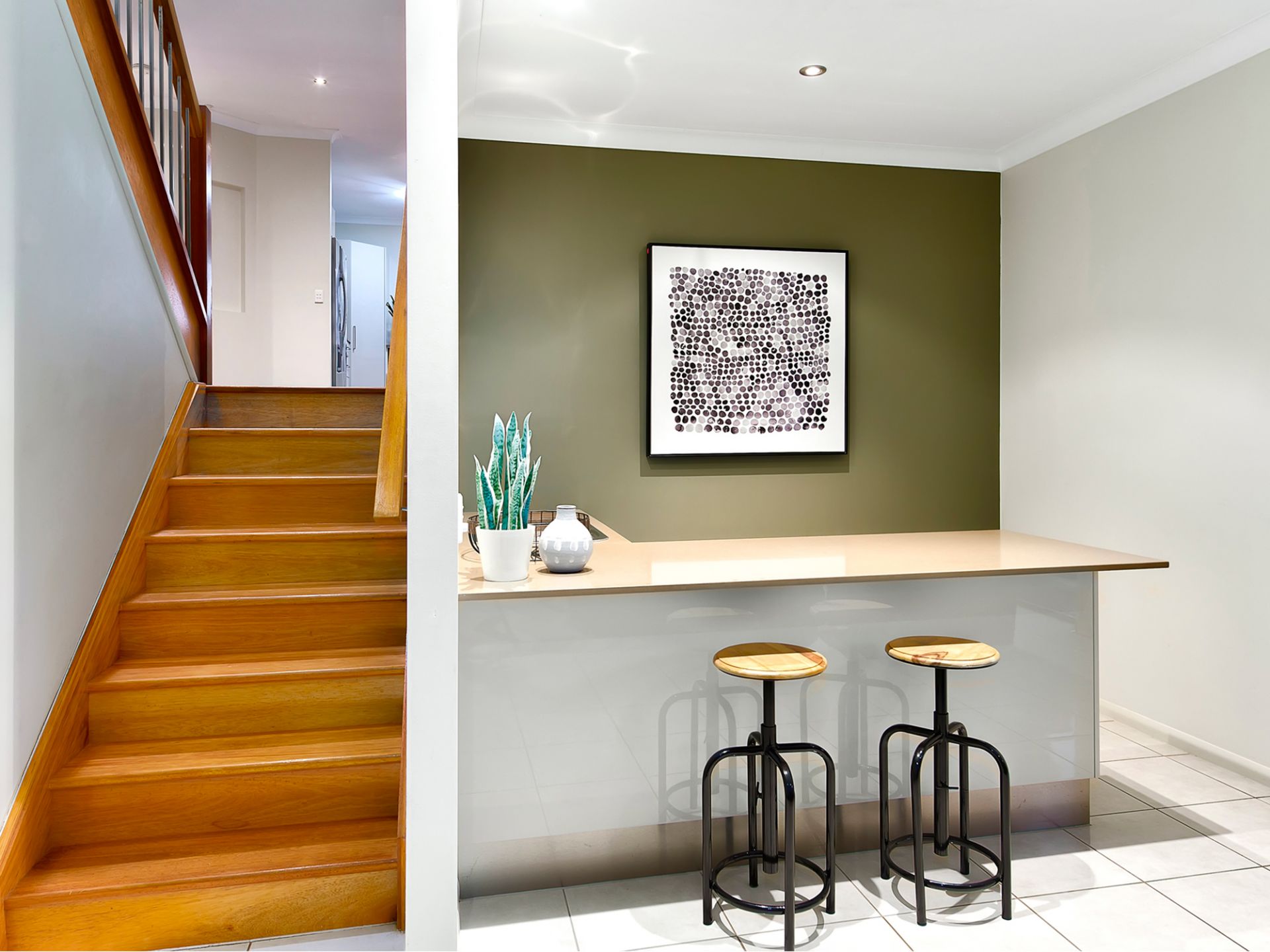 Well-appointed kitchen with caesarstone benchtops and stainless steel appliances